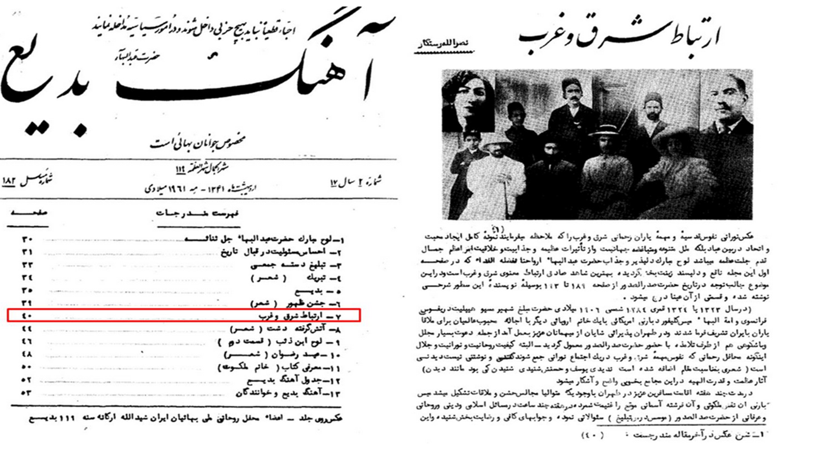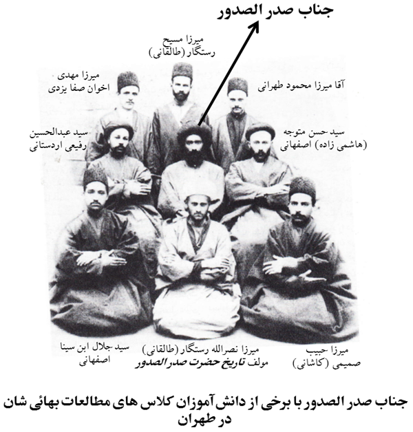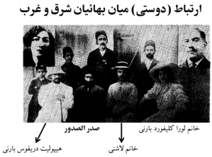 جالب این است که در سال ۱۹۰۶میلادی، دو تن از بهائیانِ غربی بهنامِ آقای هیپولیت دریفوس بارنی و خانم لورا کلیفورد بارنی که به ایران سفر کرده بودند، به مدتِ چند هفته در کلاسهای درسِ صدرالصدور شرکت کردند. یکی از هدفهای مهمِ این سفر، آشنایی و ارتباطِ بهائیانِ شرق با غرب بود، که از نظرِ عبدالبهاء قدمِ مهمی در راهِ ایجادِ وحدت و دوستی میانِ ابناءِ نوعِ بشر بود. شمارۀ اردیبهشتِ ١٣۴١ (مه ١٩۶١) «آهنگِ بدیع»، که مجلهای برای جوانانِ بهائیِ ایرانِ قبل از انقلاب بود، حاویِ مقالهای با عنوان «ارتباطِ شرق و غرب» به قلمِ نصرالله رستگار –شاگردِ صدرالصدور و مؤلف «تاریخ حضرت صدر الصدور» – است. این مقاله حاویِ یک عکسِ تاریخی از این دیدار نیز هست: